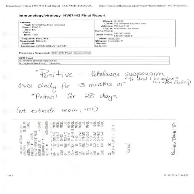 A week or so later, I received a call that Chance did have EPM! I was heartbroken! And, honestly, I was angry! Angry at Vet1 for dismissing my initial thoughts about Chance having EPM! I was reassured that he was not in any pain, but in order to ensure his safety, we needed to get him on medication ASAP!